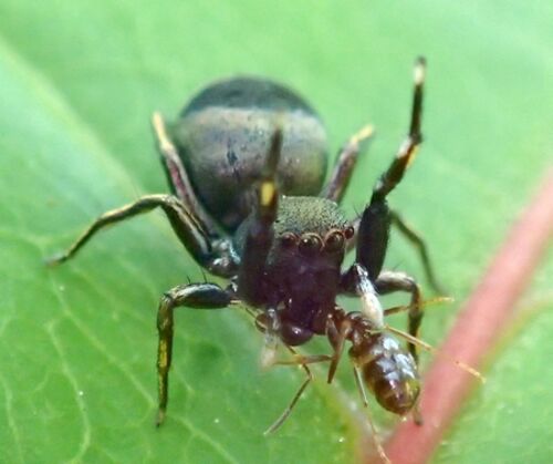 東高尾山稜で見かけた雑多な連中です。 アオオビハエトリはいつ見ても、アリを食べています。アリに擬態して、アリを捕まえて食べる。自分がアリだったら、これほど恐ろしい生き物はほかにないでしょう。 コハナグモが共食いをしてました。クモは肉食と思い…