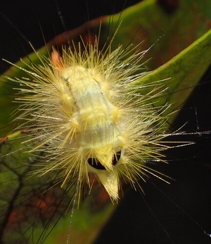 モヒカン頭にサングラス。いかにも悪役の風貌のこの毛虫は誰。 その正体は、リンゴドクガ。やっぱり悪役の毒蛾だったんですね。でも、実はリンゴドクガは、毒はないらしいです。それに、お尻にちょこんと付いた赤い毛の束がリボンのようで、可愛らしいと評判…