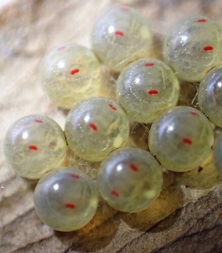 秋はカメムシの季節でもありますね。カメムシが増えるわけではありませんが、ほかの虫が減っていく中で、成虫越冬、幼虫越冬が多いカメムシが、突然大きな存在感を示すというわけです。 今回はアカスジキンカメムシ。といってもまずは卵です。葛西臨海公園で…