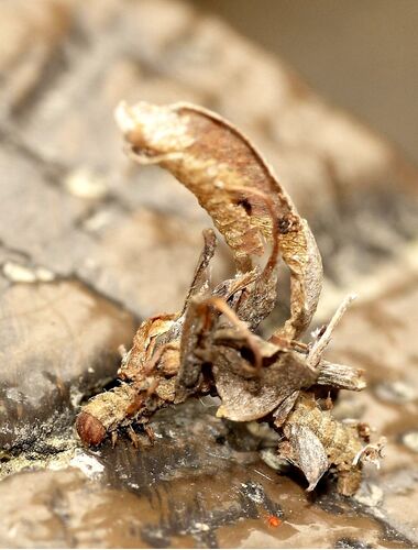 アオシャクの仲間の幼虫の中には、体にたくさんのゴミを貼り付けているゴミ擬態の芋虫がいます。 今回見つけたのは、かなり小さな幼虫なので、幼虫越冬するのかも。以前3月に大きな幼虫を見つけたことがあるので、若齢幼虫で越冬して、春に大きくなるのでは…