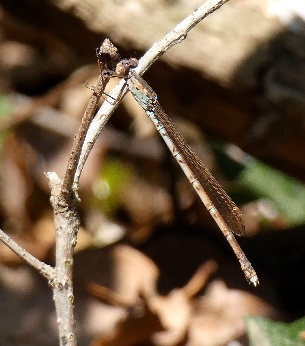 最初に見つけたのは、ホソミオツネントンボ。まだ目覚めて間もないせいなのか、青色が薄ぼんやりしてました。